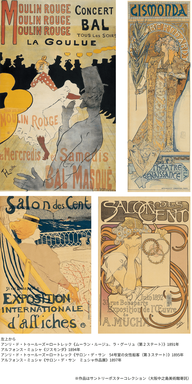 | 展示作品(一例) | 南フランス生まれのアンリ・ド・トゥールーズ=ロートレック(1864-1901 年)と、チェコ生まれのアルフォンス・ミュシャ(1860-1939 年)。いずれも芸術の都として花開いた 19 世紀末のパリにおいて、リトグラフ制作に携わり、その洗練されたポスターデザインで評価された芸術家です。本展覧会では、2 人の画業が交わりあう 1891 年から 1900 年の「パリ時代の10 年」に注目します。大阪中之島美術館寄託のサントリーポスターコレクションを中心に、彼らが制作した石版画ポスターなど「よき時代(ベル・エポック)」を感じられる作品をご覧いただきます。とりわけロートレックが制作したすべてのポスター 31 点を一挙にご紹介する貴重な機会です。