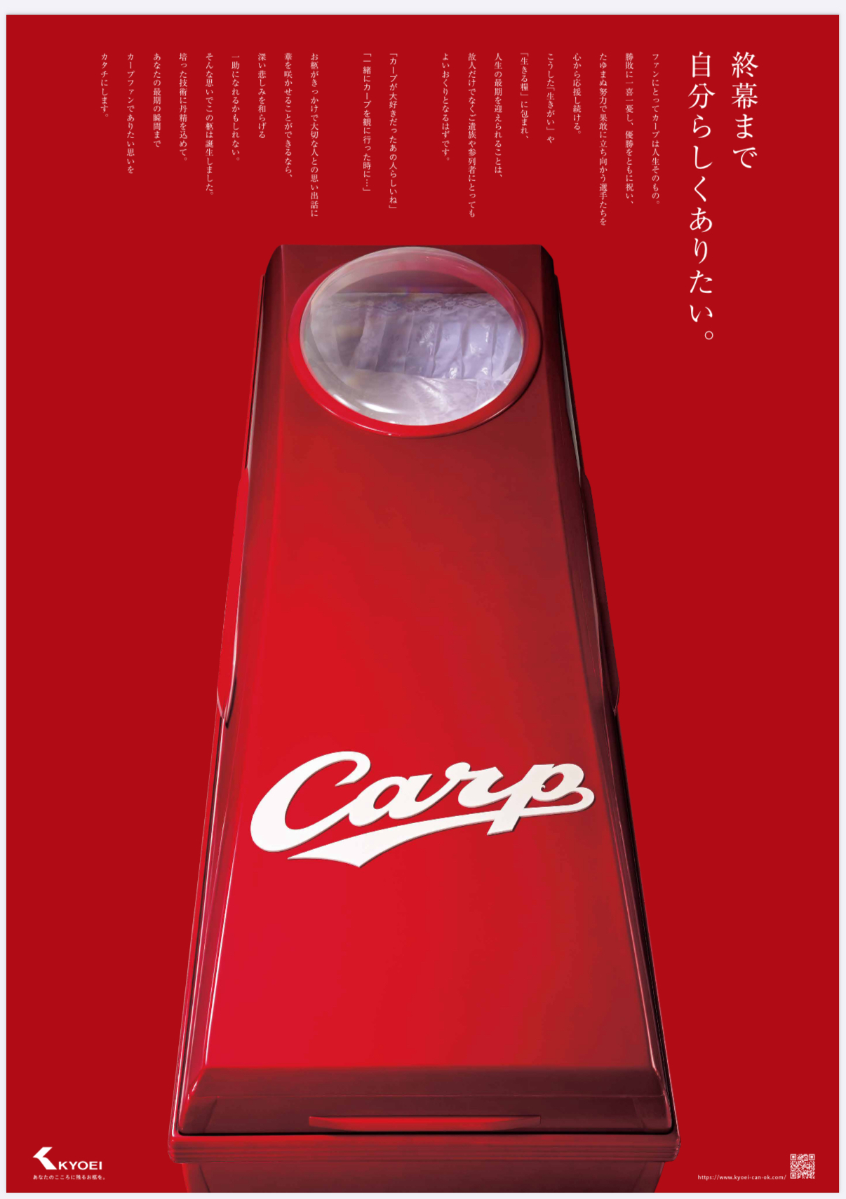 株式会社共栄は、福山で創業し55年目を迎えます。以来、「その人らしいお別れ」を大切に棺をつくり続けています。昨年、広島東洋カープ公認の赤い棺を製作しました。今回の終活イベントでは、実際に棺の中に入る「入棺体験」を行います。そのほか共栄オリジナルの棺を展示しておりますのでぜひご覧ください。大切な人との最期の時間を「もっと自由に」「もっと自分らしく」迎えていただけるように。私たちは棺を通して、ご本人やご家族の心に寄り添い、新しいお別れの形を提案してまいります。