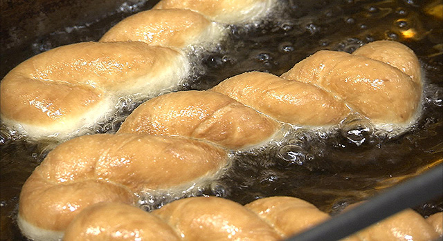 渡船に乗り込み「向島」を目指すなべさんと松本。船上、二人の目に飛び込んできた対岸の看板に「ろ」の文字が?!そこは、船に使う「櫓(ろ)」の工房。国内でただ一人ともいわれる職人さんの熟練の技に感激したふたり、早速"矢切の渡し"よろしく櫓の使い心地を体験します!!続いては向島の歴史ある商店街をぶらり。「ねじパン」や「メロンパン」が昔懐かしい老舗パン屋は戦時中、パンの配給所だったとか?!さらに「鉱泉所」なるものを発見!そこはおしどり夫婦がしまなみ唯一の「瓶入りラムネ」を作る創業5年の製造所。昔ながらの爽快な炭酸になべさん「プハーーッ」