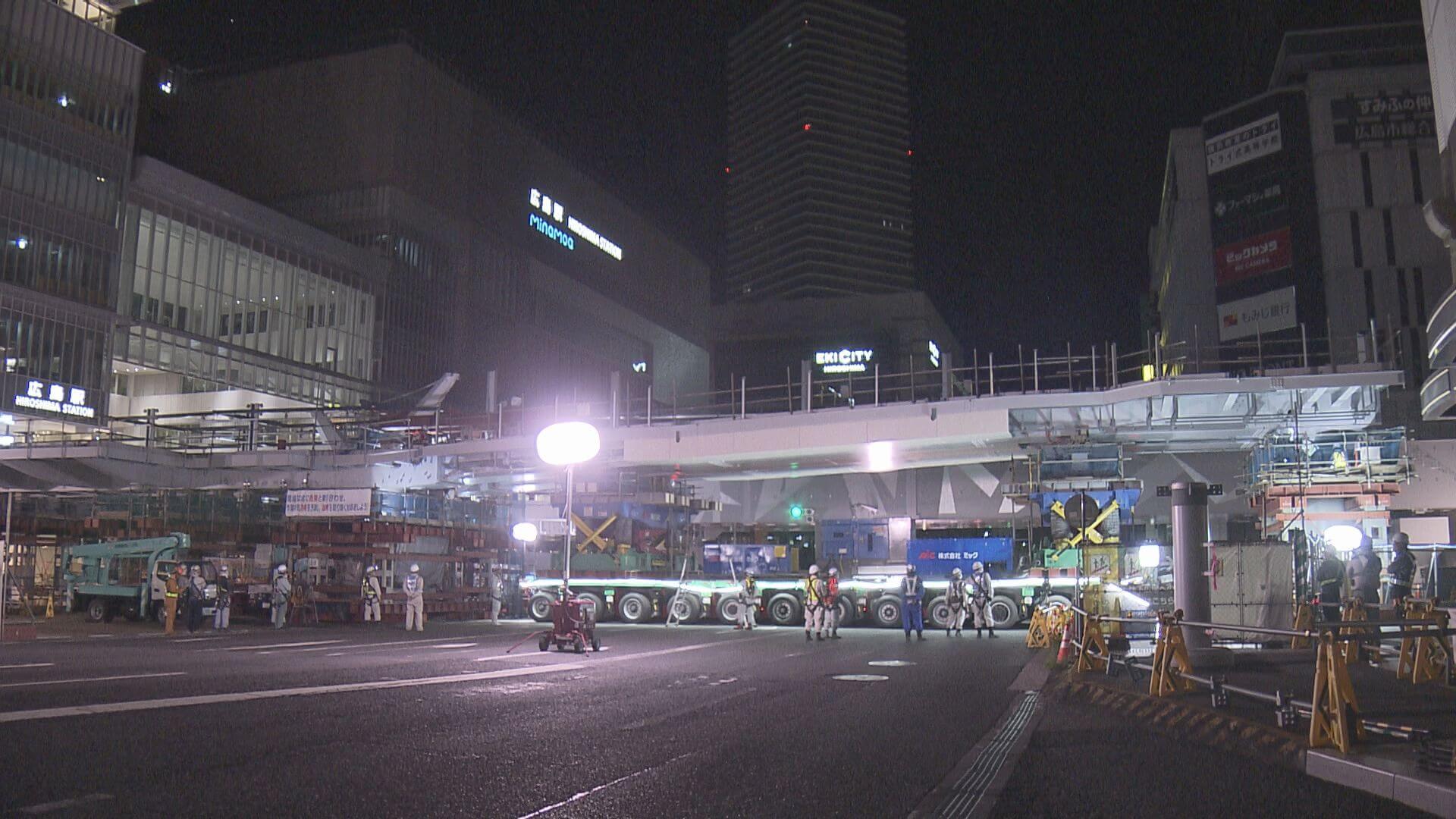 8月に運用が始まった広島駅の「駅前大橋ルート」の高架横でエールエールA館につながるペデストリアンデッキの架設工事が行われました。
