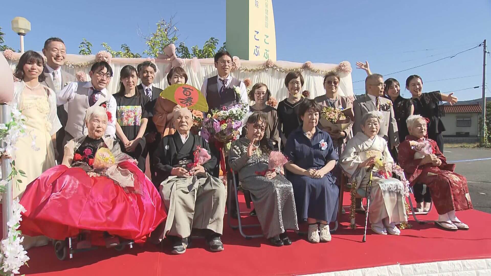 福祉施設の駐車場に設けられたランウェイを着物やドレスに身を包んだ参加者たちが歩きます。10人の参加者の年齢はなんと78歳以上です。