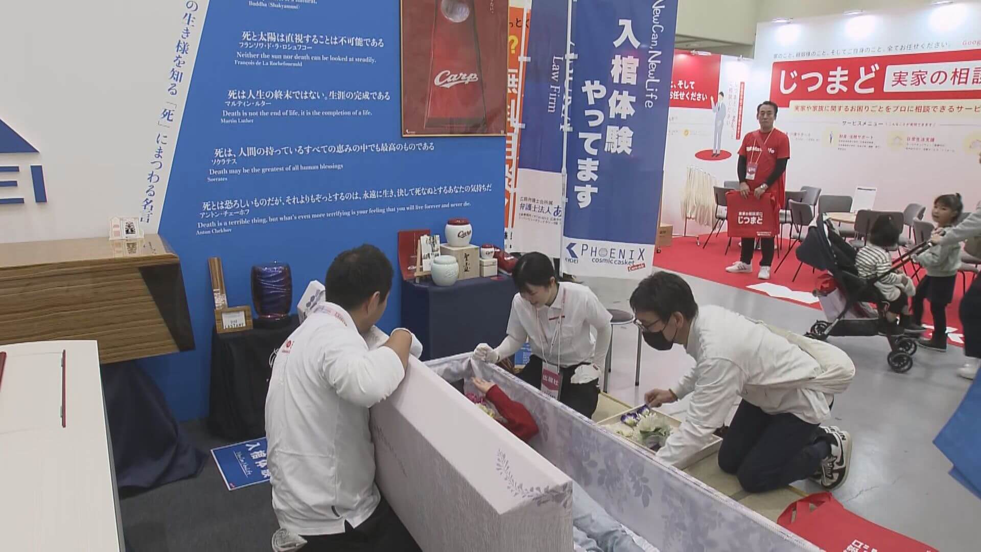 南区の広島産業会館で15日から開かれている「LASTART」。「終活」について前向きに学ぶイベントとして、葬儀、遺影についての相談や、棺に実際に入る体験など24のブースが出展しています。