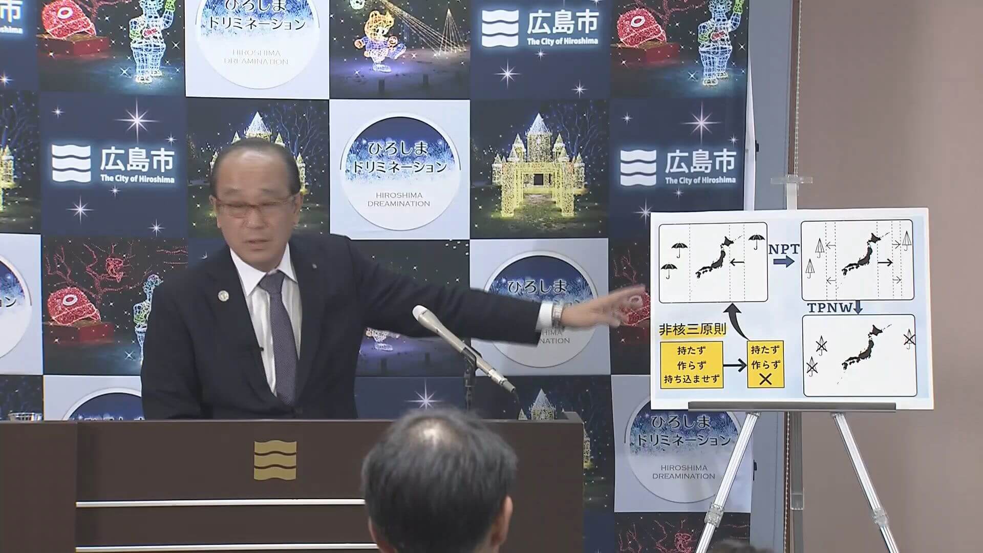 19日、定例会見に臨んだ広島市の松井市長は、「緊張を緩和することに主眼を置いて、国民の命を守るためのあらゆる外交努力をしていくべきだ」と述べました。また、国家間の緊張を高める対応をすべきではないと非核三原則を堅持すべきとの考えを示しました。