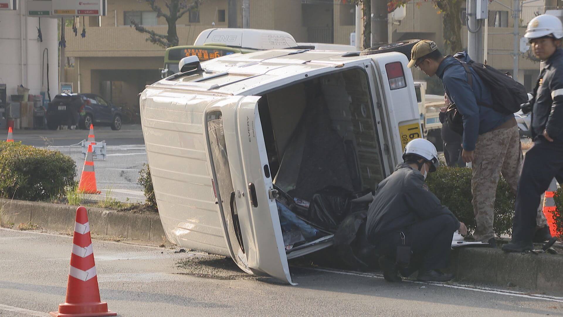 警察や消防によりますと、26日午前7時頃、広島市中区の牛田大橋南詰交差点付近で左折しようとした軽バンが中央分離帯に衝突し、対向車線にいた車2台も巻き込まれる事故がありました。