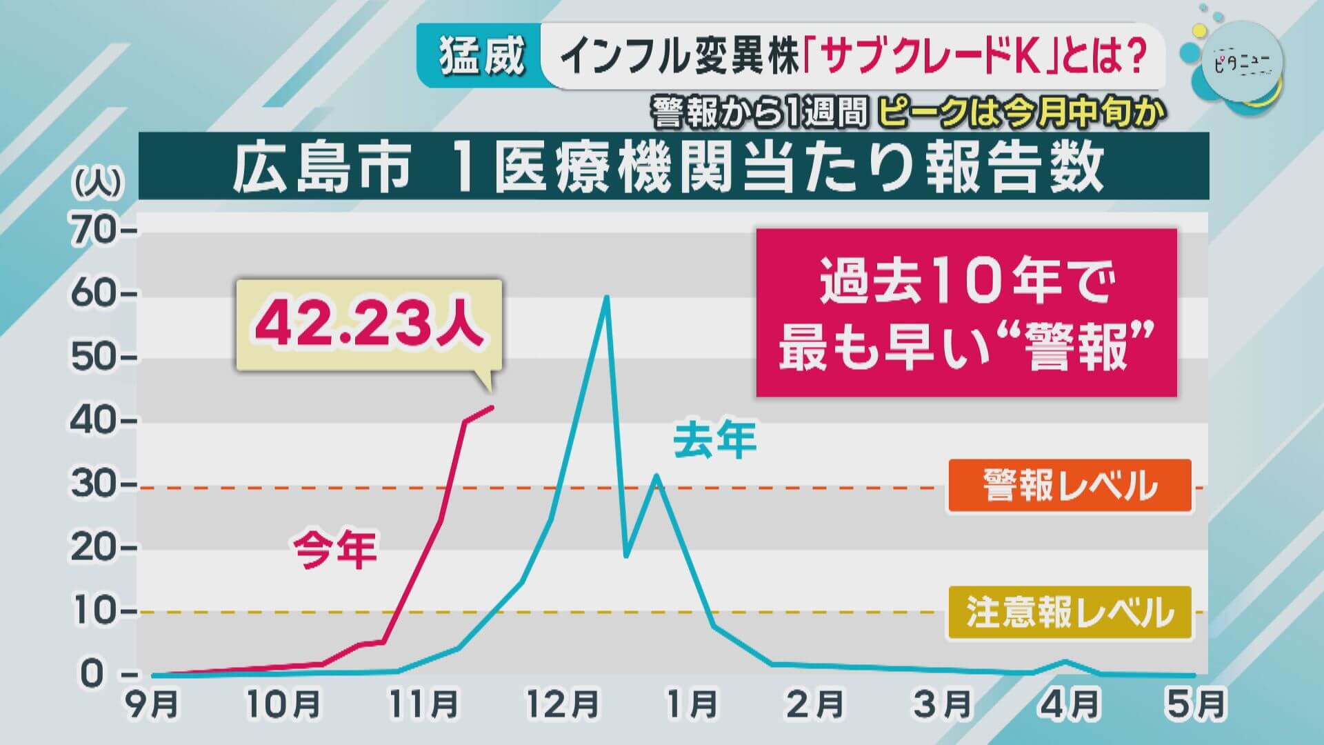 3日に発表された広島市内の1医療機関あたりのインフルエンザ患者数は42.23人と2週連続で警報レベルの30人を超え、ここ数週間で急激に増加しています。
