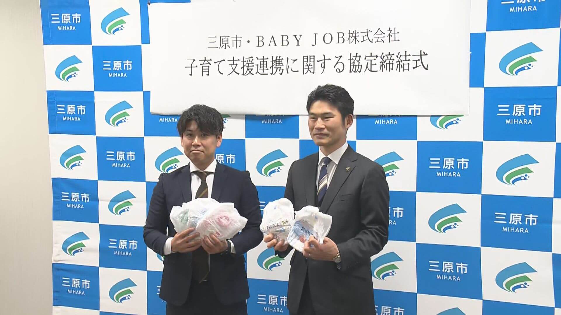 三原市は、おむつの定額利用サービスなどを運営する事業者と子育て支援の連携協定を結びました。