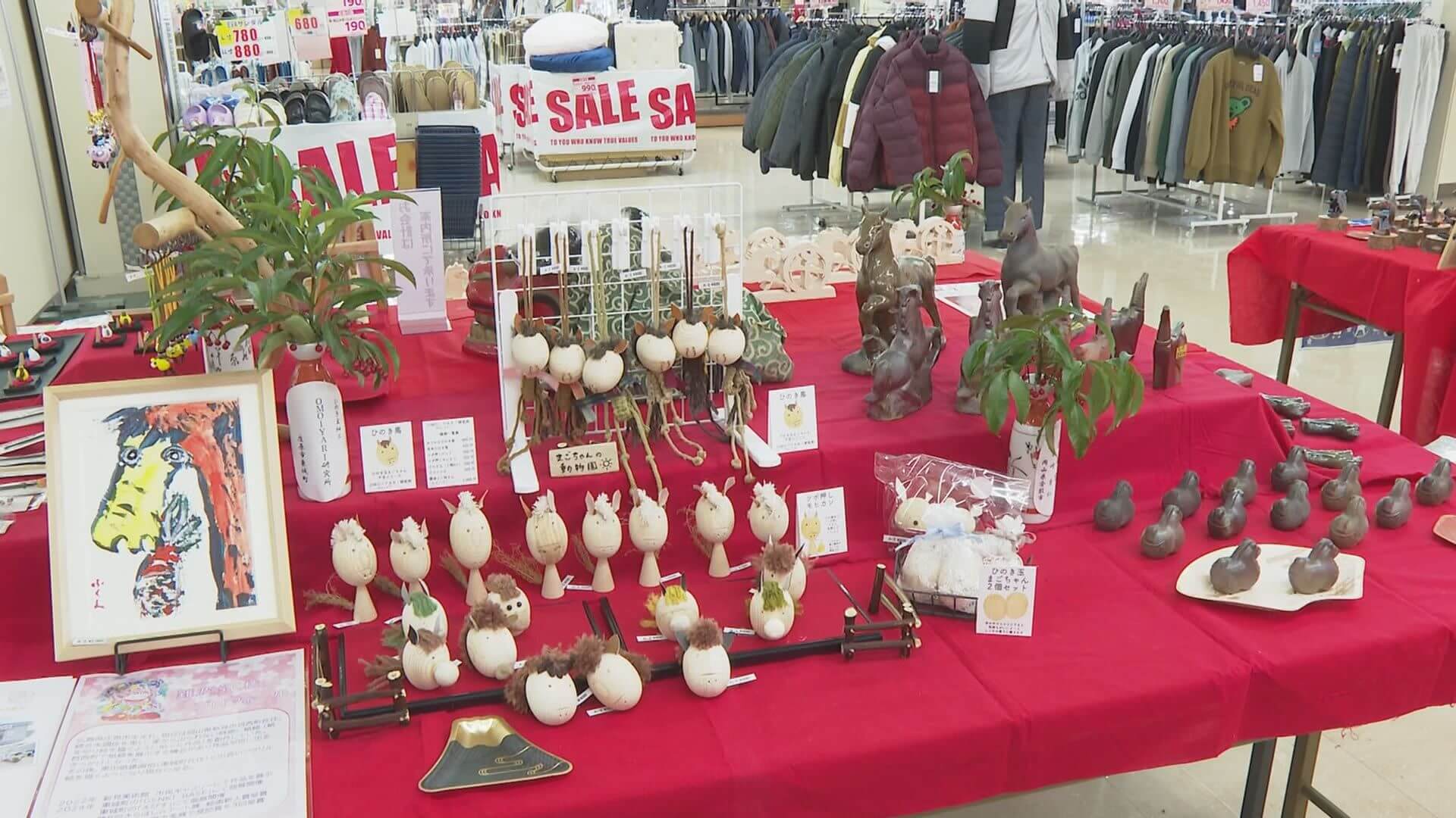 庄原市西本町のショッピングセンターで開かれている「手仕事 里山の干支展」は今年で23回目、来年の干支「午」をテーマにした約500点の作品が会場一杯に並びます。