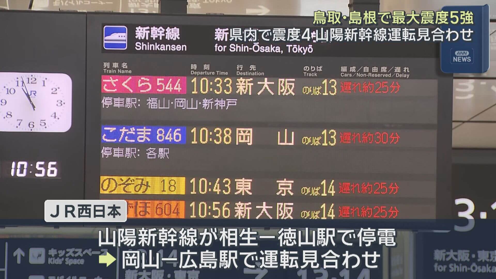 JR西日本によりますとこの地震で山陽新幹線が兵庫県の相生駅と山口県の徳山駅の間で停電が発生し、新大阪ー博多間で運転を見合わせました。