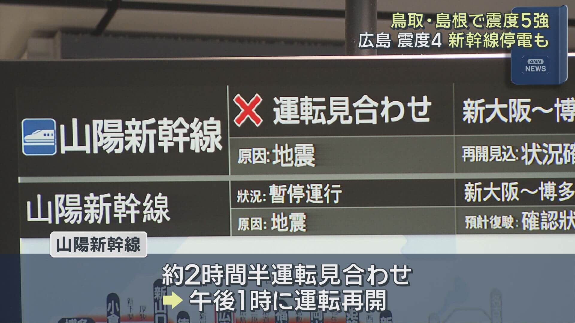 JR西日本によりますとこの地震で山陽新幹線の兵庫県の相生駅と山口県の徳山駅の間で停電が発生し、岡山ー広島間で約2時間半運転を見合わせていましたが、午後1時に運転を再開しました。