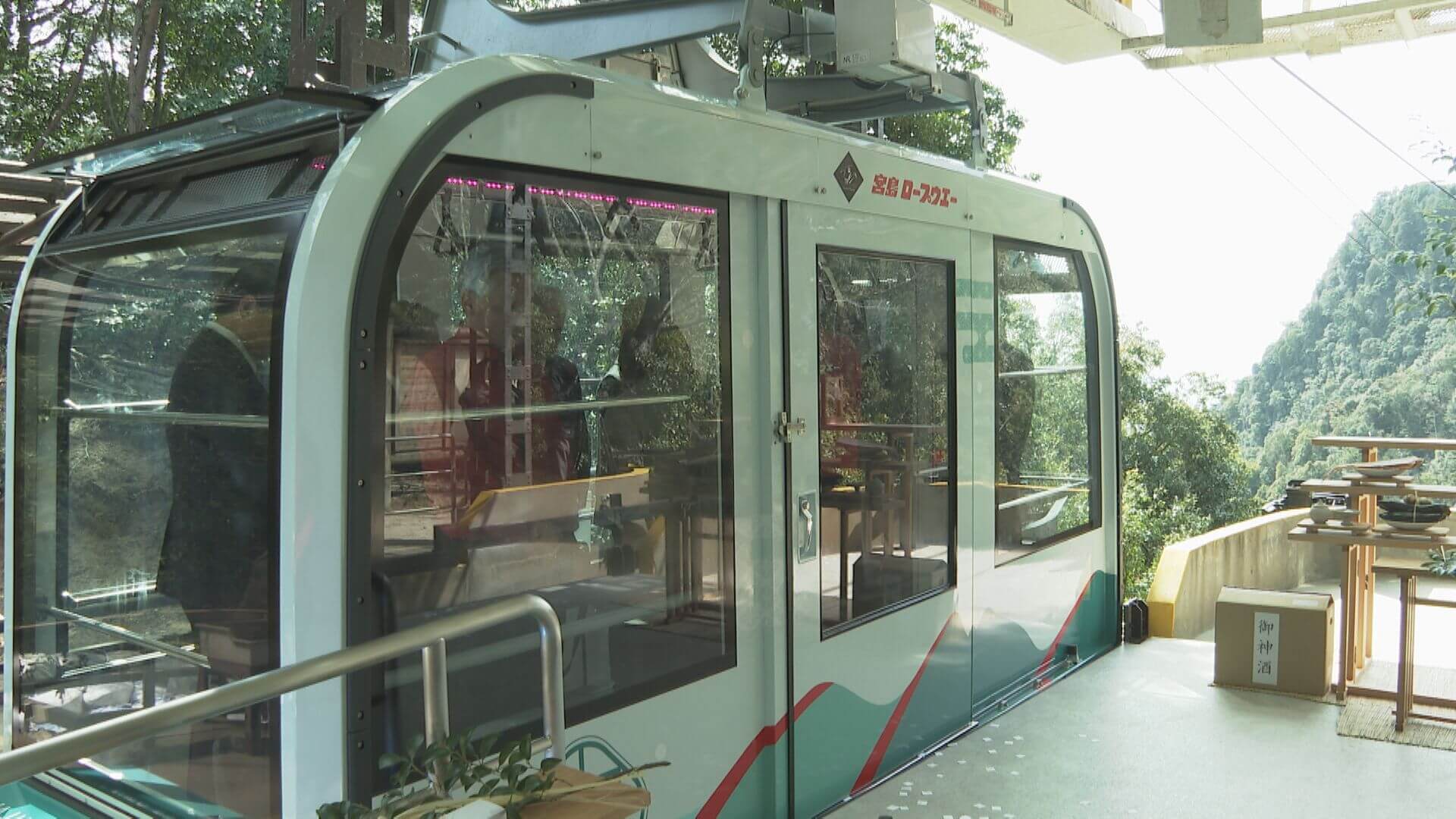 宮﨑玲太記者「宮島ロープウエーの新しいゴンドラが公開されました。デザインが一新され室内は従来より広く快適な作りになっています」