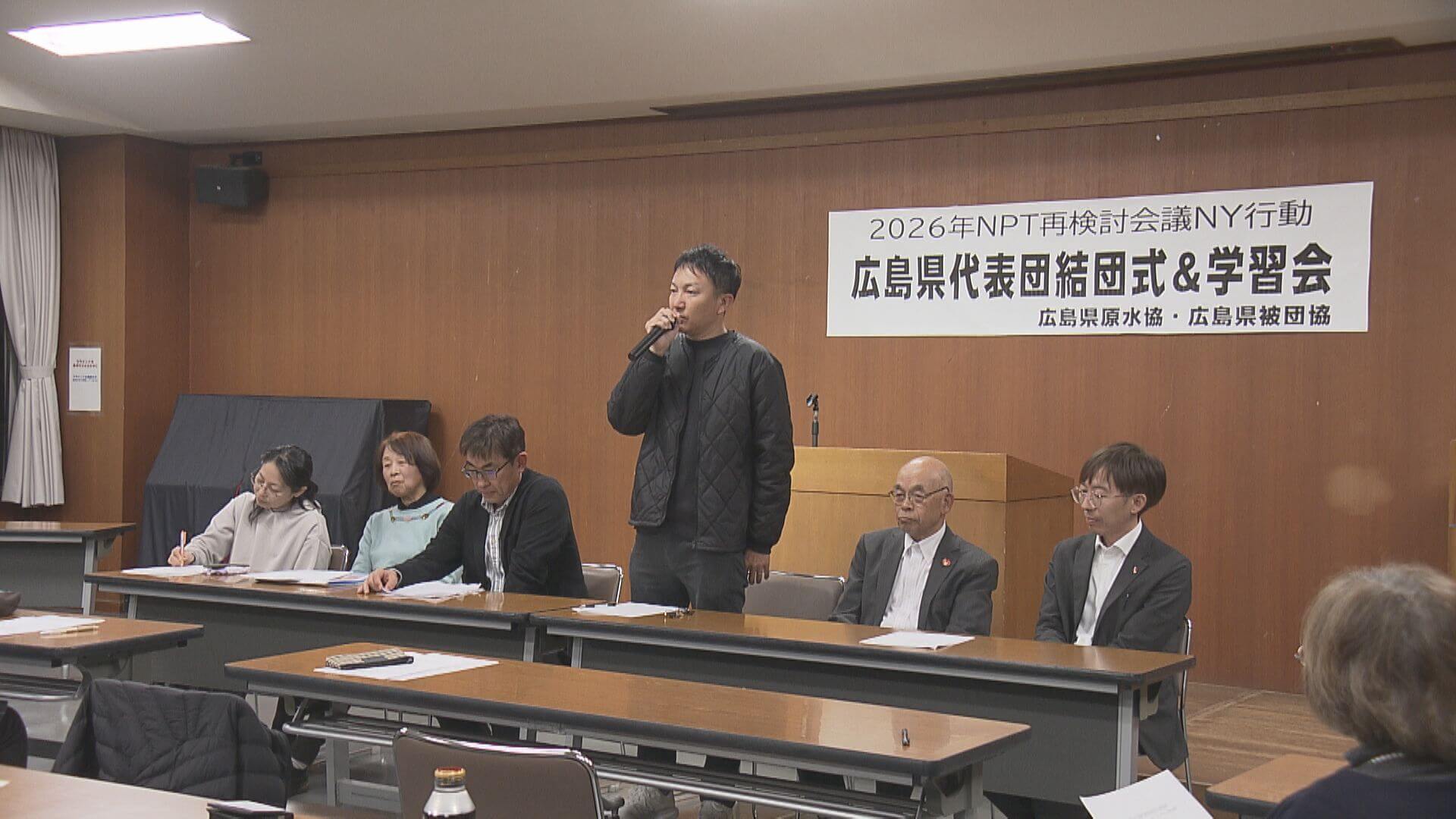 今月27日からニューヨークで開かれるNPT=核拡散防止条約再検討会議に派遣される佐久間邦彦さんらが結団式を行いました。