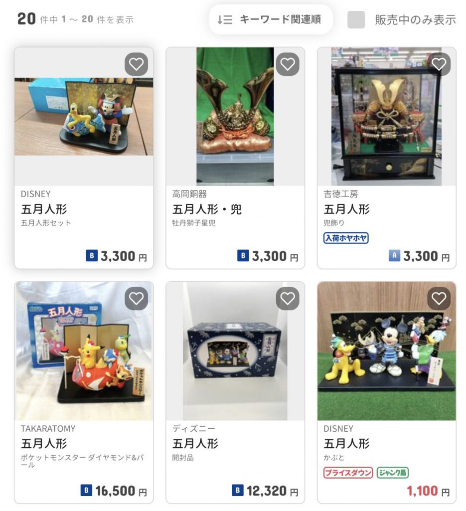 また、ハードオフグループのオンラインショップ「OFFモール」でも、中古の五月人形が実際に販売されています。